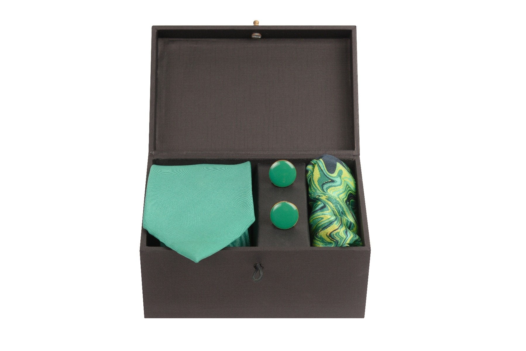 Rich, Pure Silk, Plain silk made tie. Paired with a printed pocket square from Marble design and pair them with the matching Plain green enamel based cufflinks . For the complete look. Great with a Black or Grey Jacket. Suitable for formalwear, casualwear and occassions. Elegant packaging for gifting.