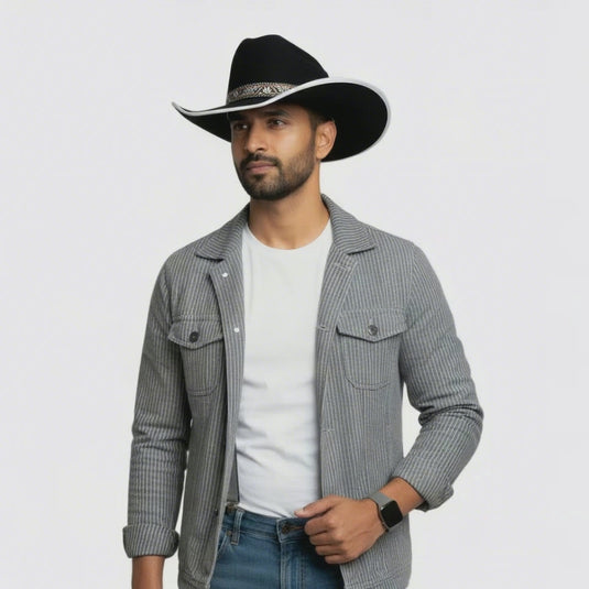 Elevate your accessory game with our stunning Chokore Urban Icon Cowboy Hat, handmade from 100% premium wool. This exquisite hat is adorned with a unique ribbon and rope design that adds a touch of sophistication, making it a versatile addition to any wardrobe. Featuring a printed belt design, it beautifully blends style and functionality. The adjustable ribbon allows for a perfect fit, ensuring comfort for all-day wear.