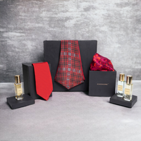 • Package contains: " 1 x Red Silk Necktie - Solid Collection, 1 x Burgundy Silk Pocket Square- Indian at Heart Collection, 1 x Red & Black Cravat - Plaids Collection, 1 x Perfumes Combo - 3 x 20 ml "