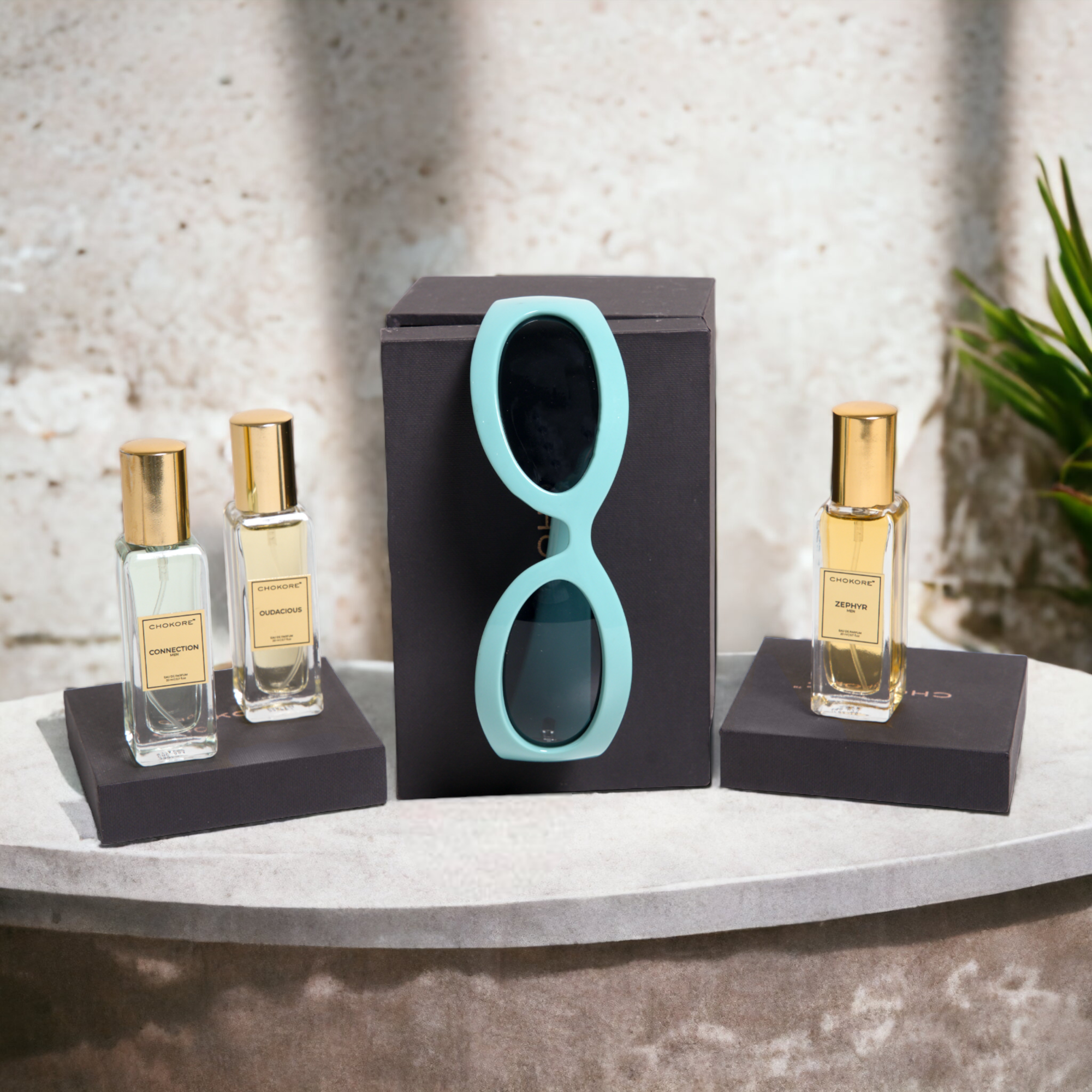 "Embrace a journey of style with our Sunglasses and Perfumes Combo! Adorn your eyes with these sunglasses, designed to add a pop of fun and flair to any look. Complement your ensemble with our carefully curated Perfumes Combo, each scent a unique adventure that captivates the senses. Whether you're exploring the city or attending a vibrant event, this combo redefines your style, ensuring you're effortlessly chic and delightfully fragrant."