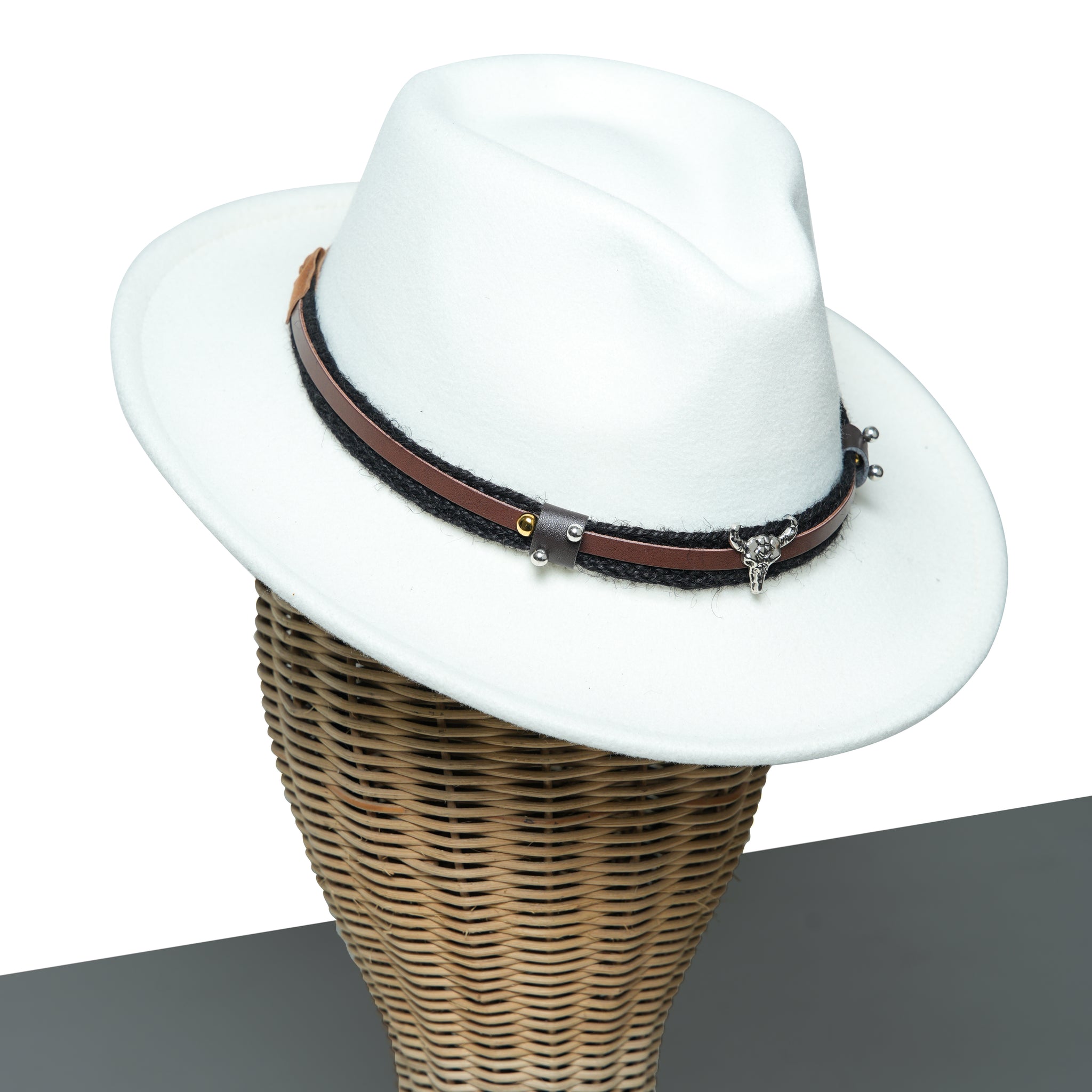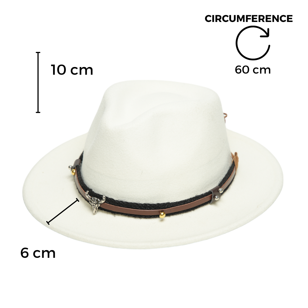 This hat is a true symbol of rugged Western charm and untamed style. The classic Fedora silhouette is elevated by the addition of an oxhead belt that captures the essence of the wild frontier. Whether you're navigating urban landscapes or stepping out for a night on the town, our Fedora with its oxhead band is the perfect accessory to complement your Western-inspired ensemble.