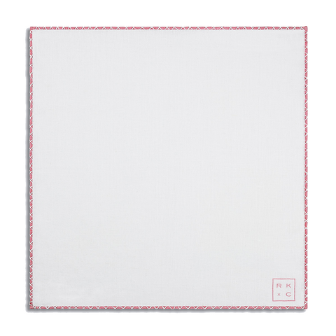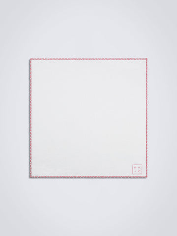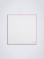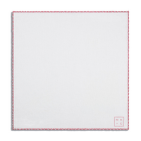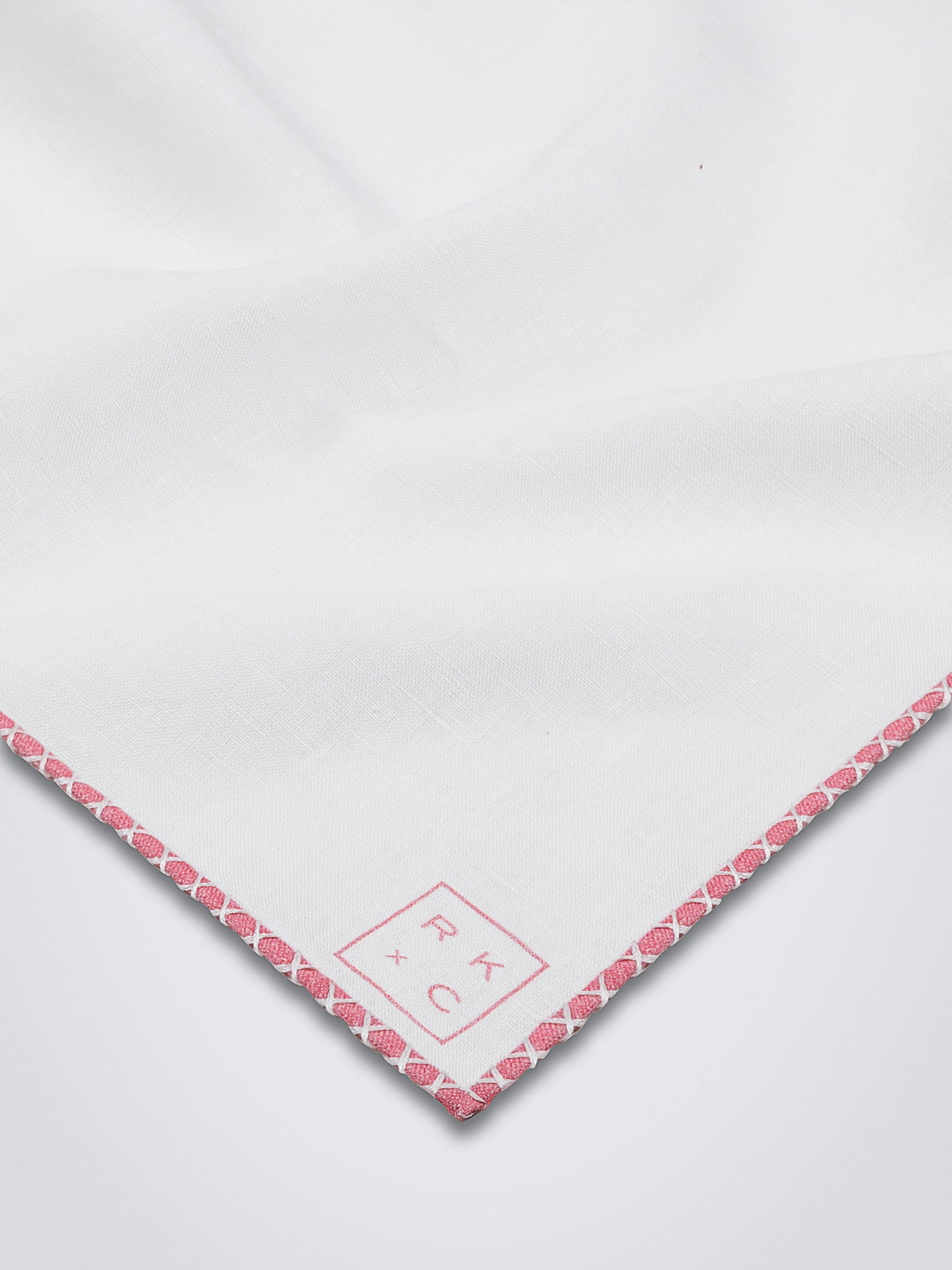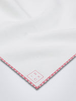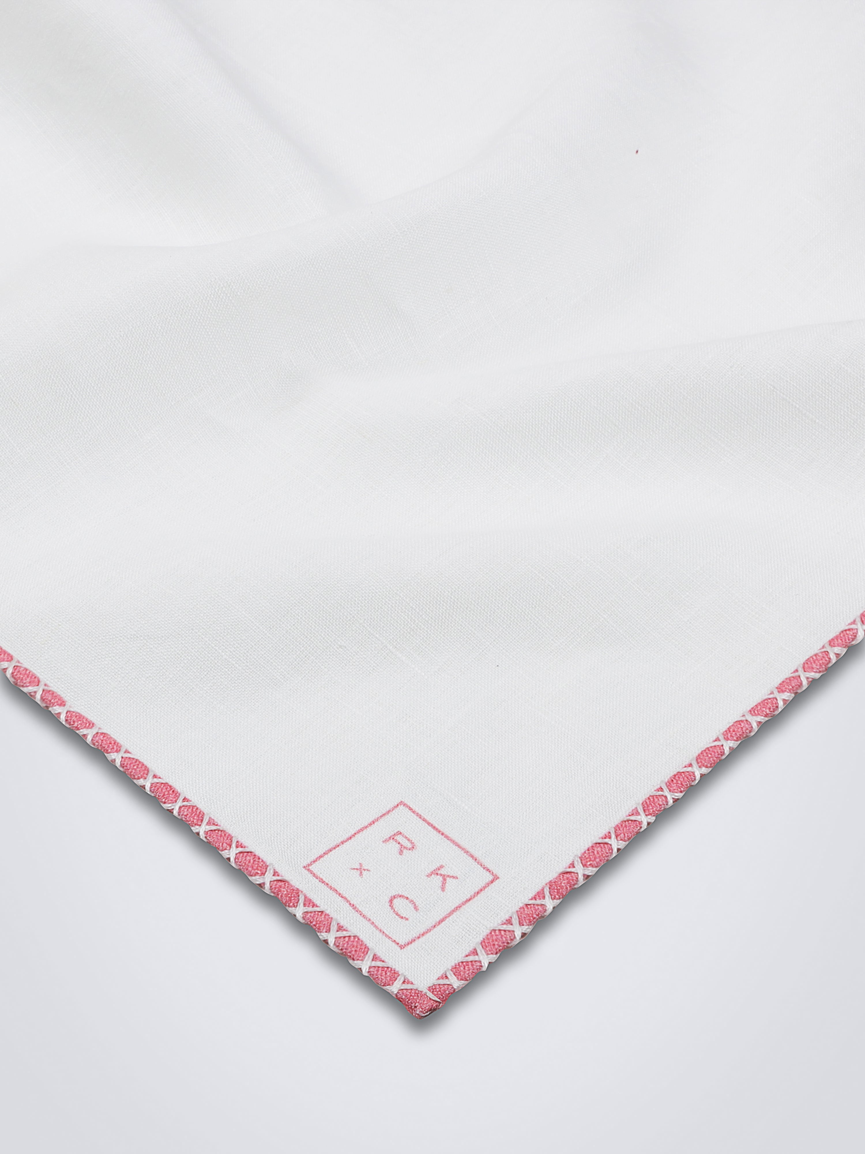 Crafted of pure white linen with hand-rolled pink edges and finished with delicate hand-stitching in white.