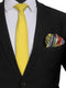 Rich, Pure Satin Silk, Yellow color silk solid tie. Paired with a Two-in-one Red & Yellow Silk Pocket Square. For the complete look. Great with a Black, Brown or Grey Jacket. Suitable for formalwear, casualwear and occassions. Elegant packaging for gifting.