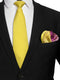 Rich, Pure Satin Silk, Yellow color silk solid tie. Paired with a Two-in-one Yellow & Purple Silk Pocket Square from Indian At Heart designs. For the complete look. Great with a Black, Brown or Grey Jacket. Suitable for formalwear, casualwear and occassions. Elegant packaging for gifting.