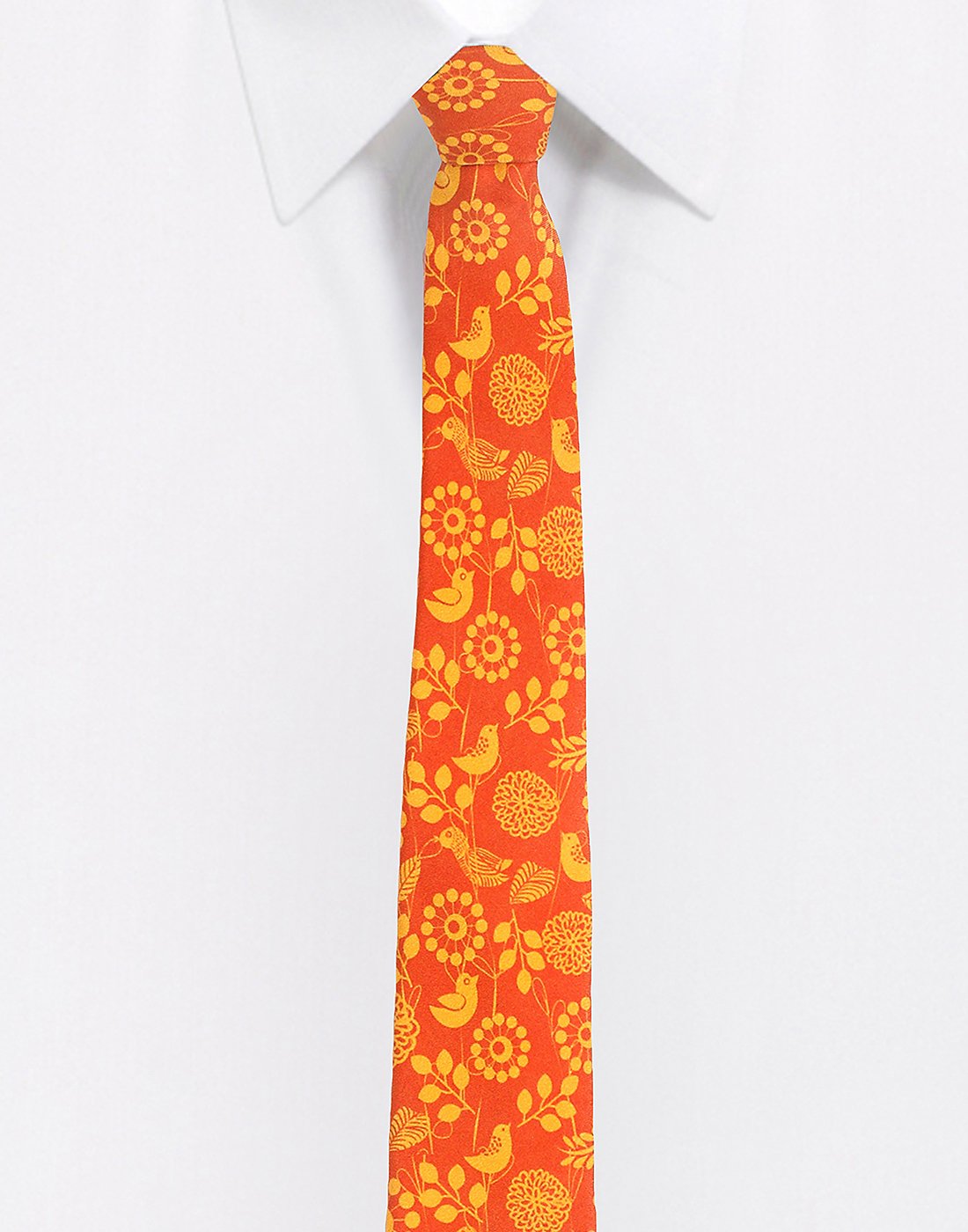 This tie, presented in bright shades of orange and designed with free bird motifs is a style statement in itself. Wearing it to a meeting with and a dark-coloured jacket can just be a trend-setter. What’s the wait for? Get yourself this tie, crafted in pure twill silk and designed with the intention to make your look elegant. You may want to add a light-orange plain pocket square to add some more style to your look.