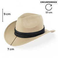 "Behold the Cowboy Hat with Ribbon Detailing, a mesmerizing fusion of vintage charm and modern pizzazz! This dashing head-topper is the epitome of elegance, with a twist of style. The classic cowboy silhouette gets a delightful upgrade with a black ribbon, adding a pop of elegance and a touch of playfulness to your ensemble. Whether you're strolling through bustling city streets or attending a boho-chic garden party, this hat will make heads turn and hearts skip a beat. So channel your inner Gatsby, embrace the retro vibes, and let this Hat with Ribbon detailing transport you to a world where style reigns supreme."