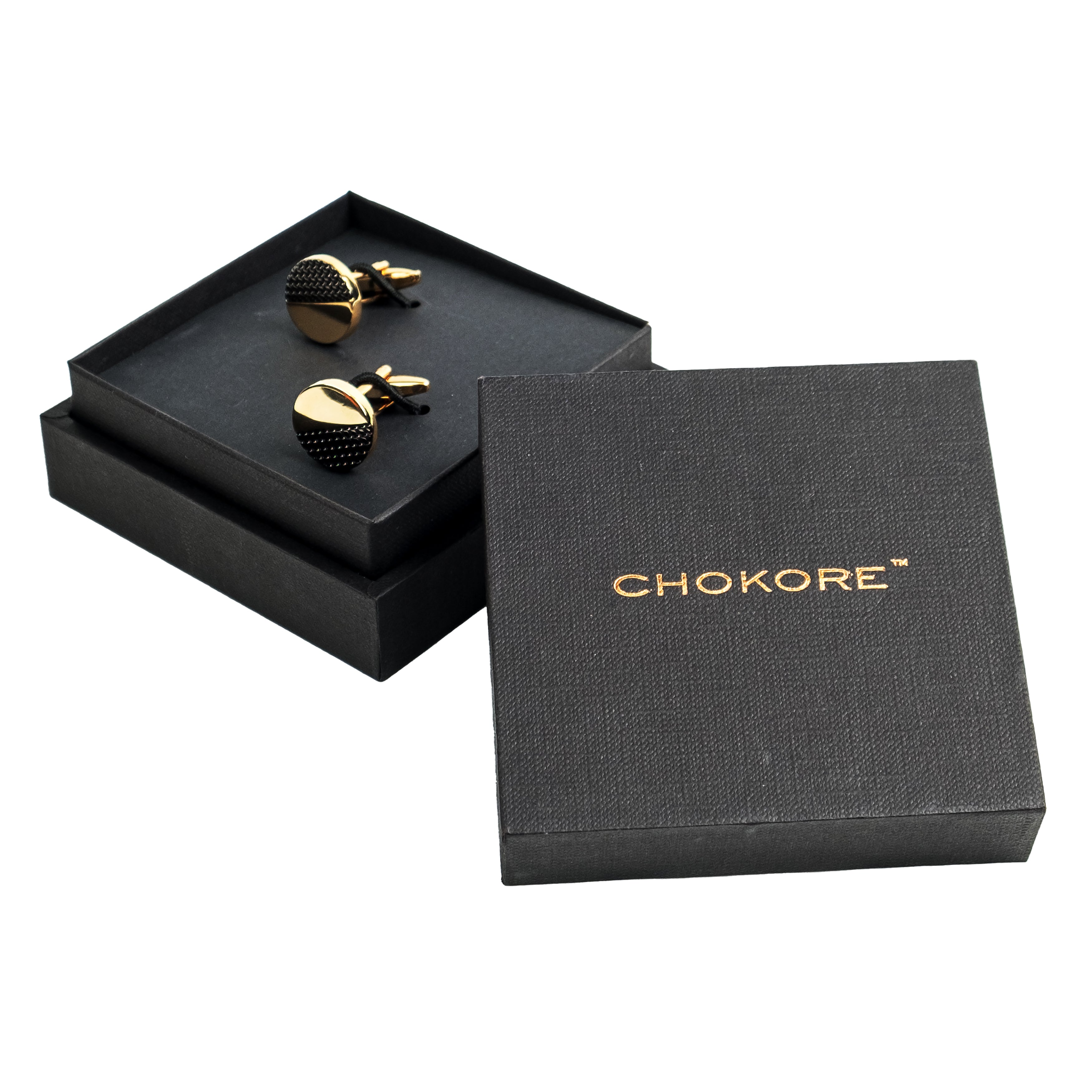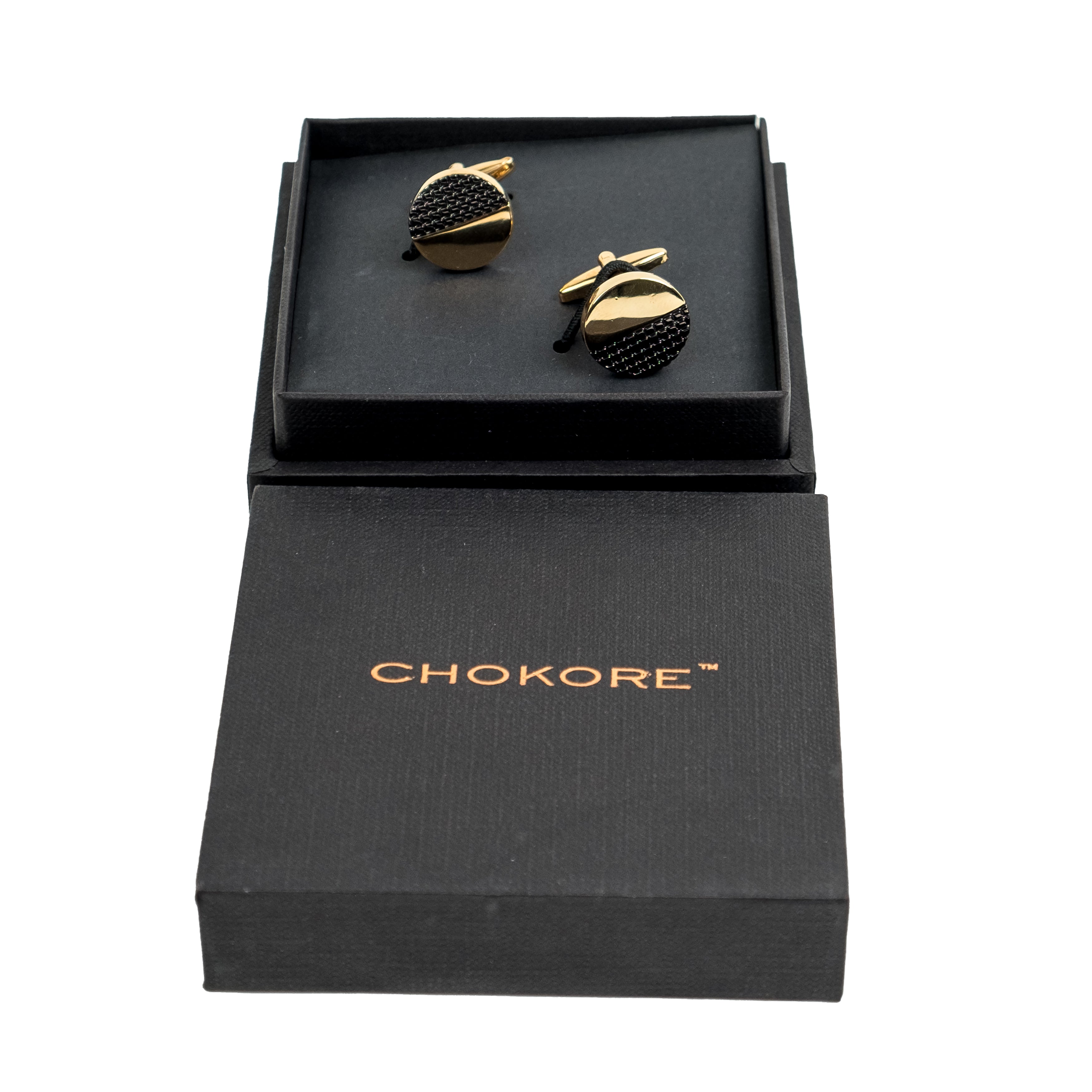 Enhance your modern formal style with Chokore’s half-textured gold and black brass cufflinks. Unique dual-texture design perfect for formal occasions.