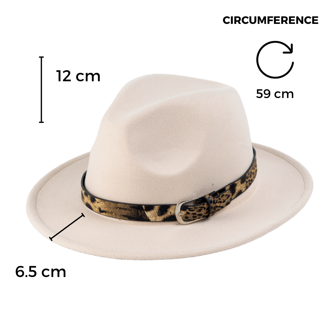 "Introducing our ferociously fabulous Fedora Hat with Leopard belt! With a wide brim that's and a leopard-printed belt, this hat screams fierce and fabulous. It's perfect for those who dare to be wild and walk on the wild side of fashion. Crafted with impeccable style and quality, this hat will make heads turn and jaws drop. So embrace your inner fashion enthusiast and unleash your untamed style with our Leopard Belt Fedora Hat.
