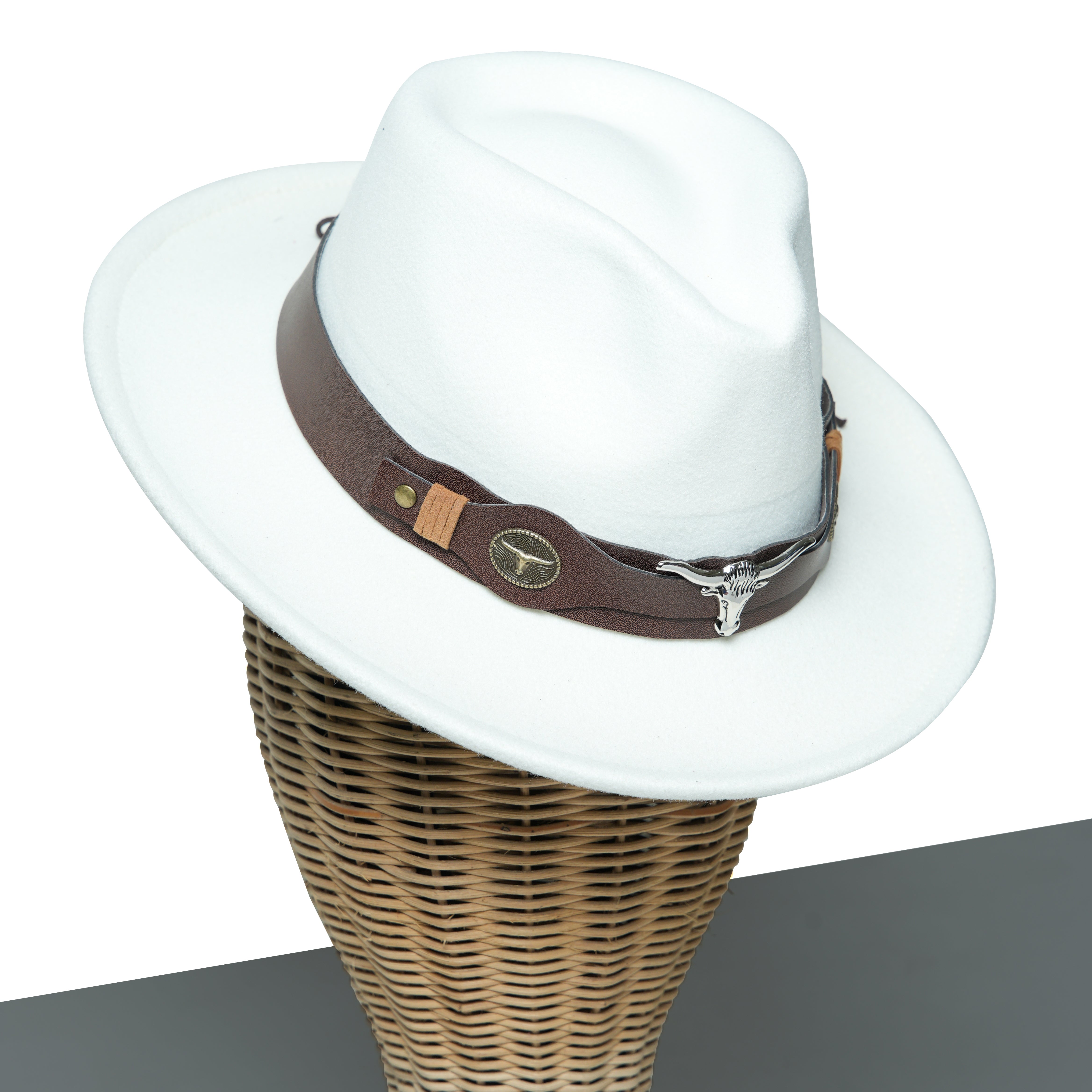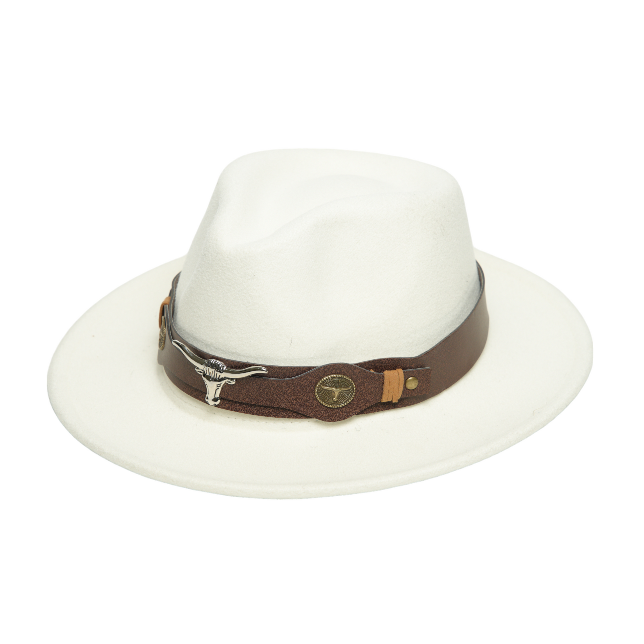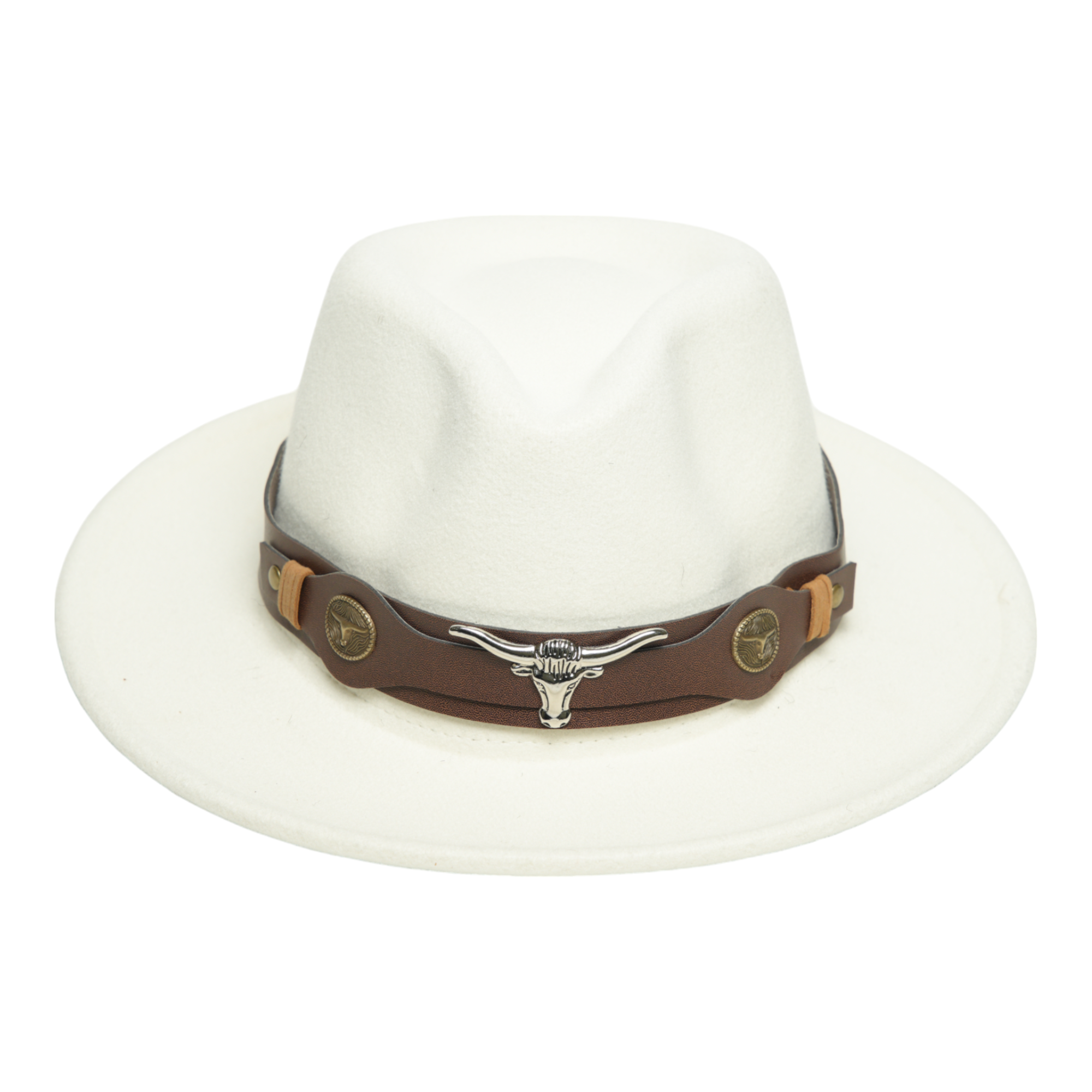 Step into the timeless allure of the American West with our Fedora featuring a distinctive oxhead belt!