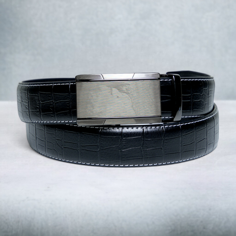 The Chokore Formal Ratchet Leather Belt in Black is a stylish and practical accessory. It has a sleek black leather strap and a modern ratchet buckle that lets you adjust it easily without holes. The high-quality leather is durable and looks polished, making it perfect for formal occasions. This belt adds a touch of elegance to any outfit while being comfortable and functional.