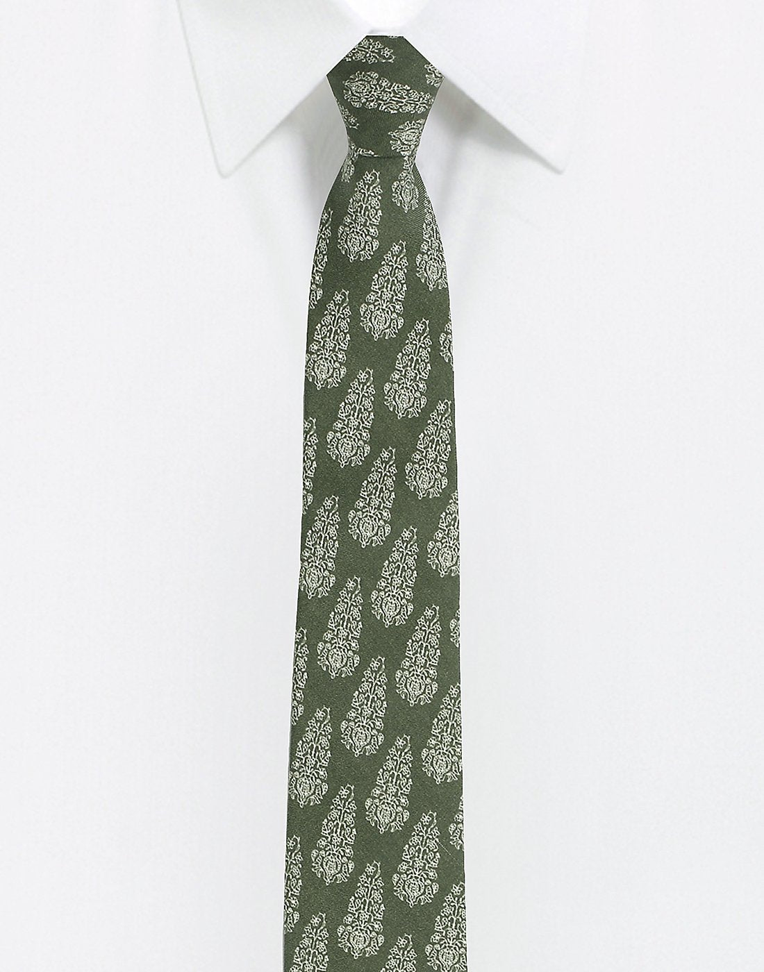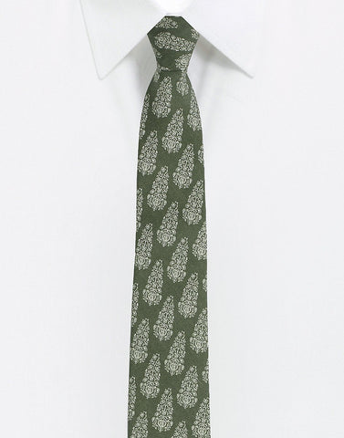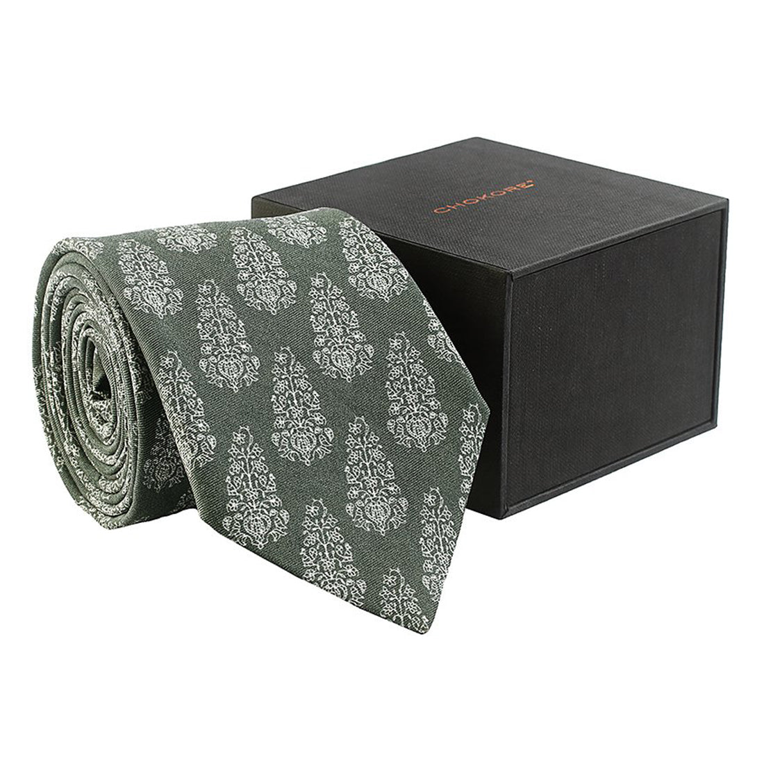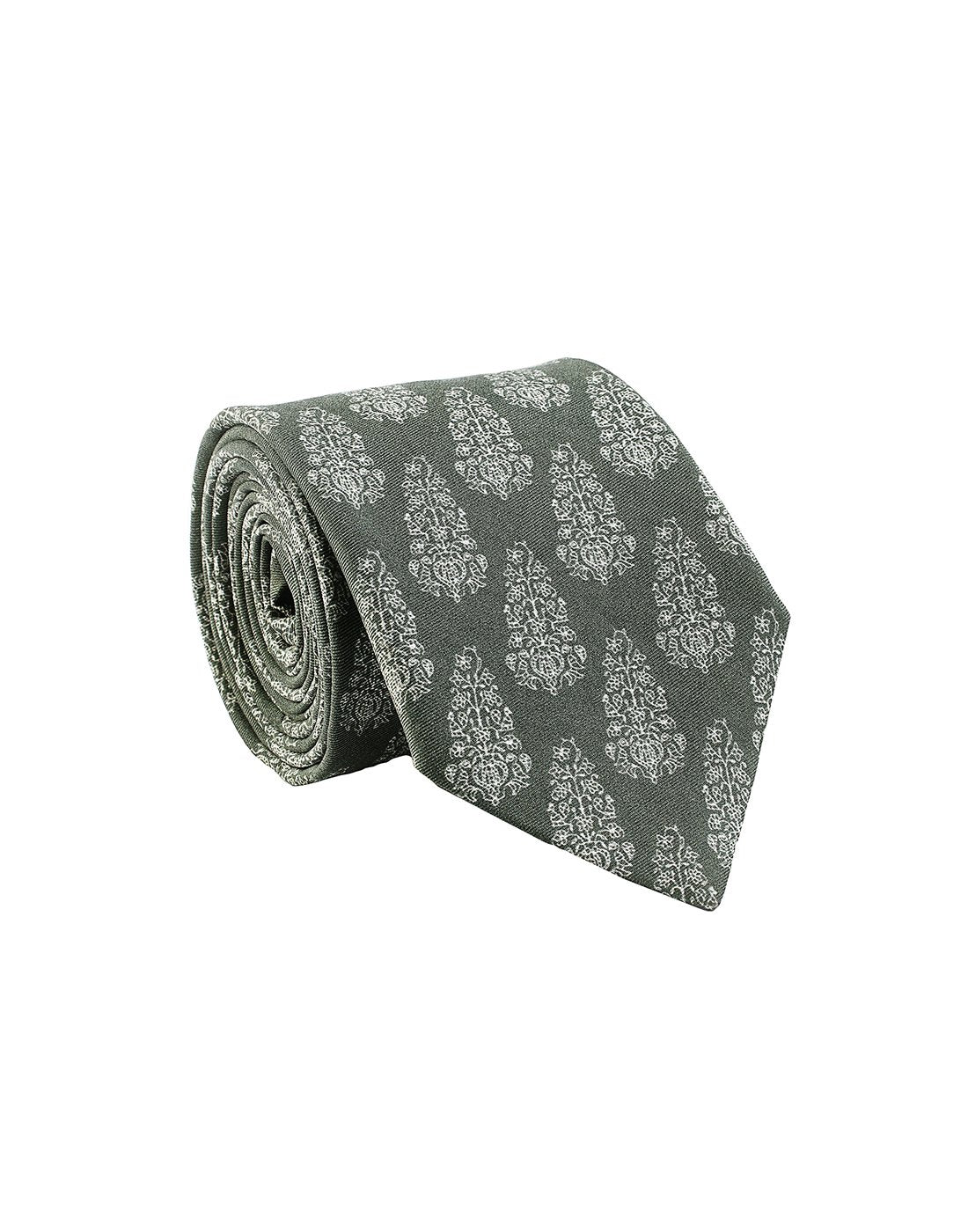 A tie adds style and elegance to a man's personality. This tie, dark grey with an Indian motif, is made with Twill Silk. The tie can be worn by pairing it with any plain jacket and a plain pocket square from Chokore.