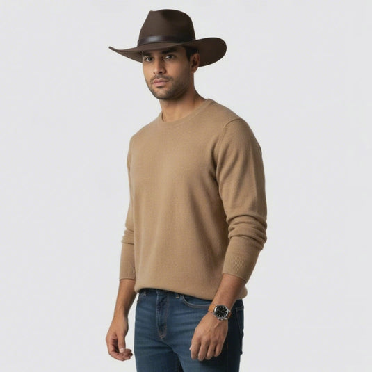 Introducing our 100% handmade Chokore Rustic Bridlewood Cowboy Hat, crafted from the finest Australian wool for unmatched quality and comfort. This stylish brown hat features a teardrop crown and a wide brim that not only enhances your look but also provides excellent sun protection during outdoor adventures. The binding edge design on its leather belt adds a touch of sophistication while complementing the hat's rustic charm. Its versatile design makes it an ideal accessory for any wardrobe.