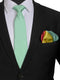Rich, Pure Satin Silk, Sea Green color solid tie. Paired with a Four-in-one Multicolor printed solid design pure silk pocket square. For the complete look. Great with a Black or Grey Jacket. Suitable for formalwear, casualwear and occassions. Elegant packaging for gifting.