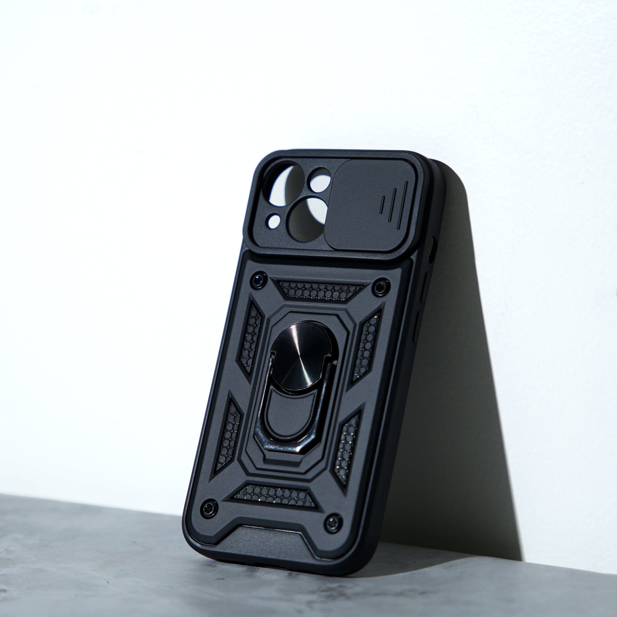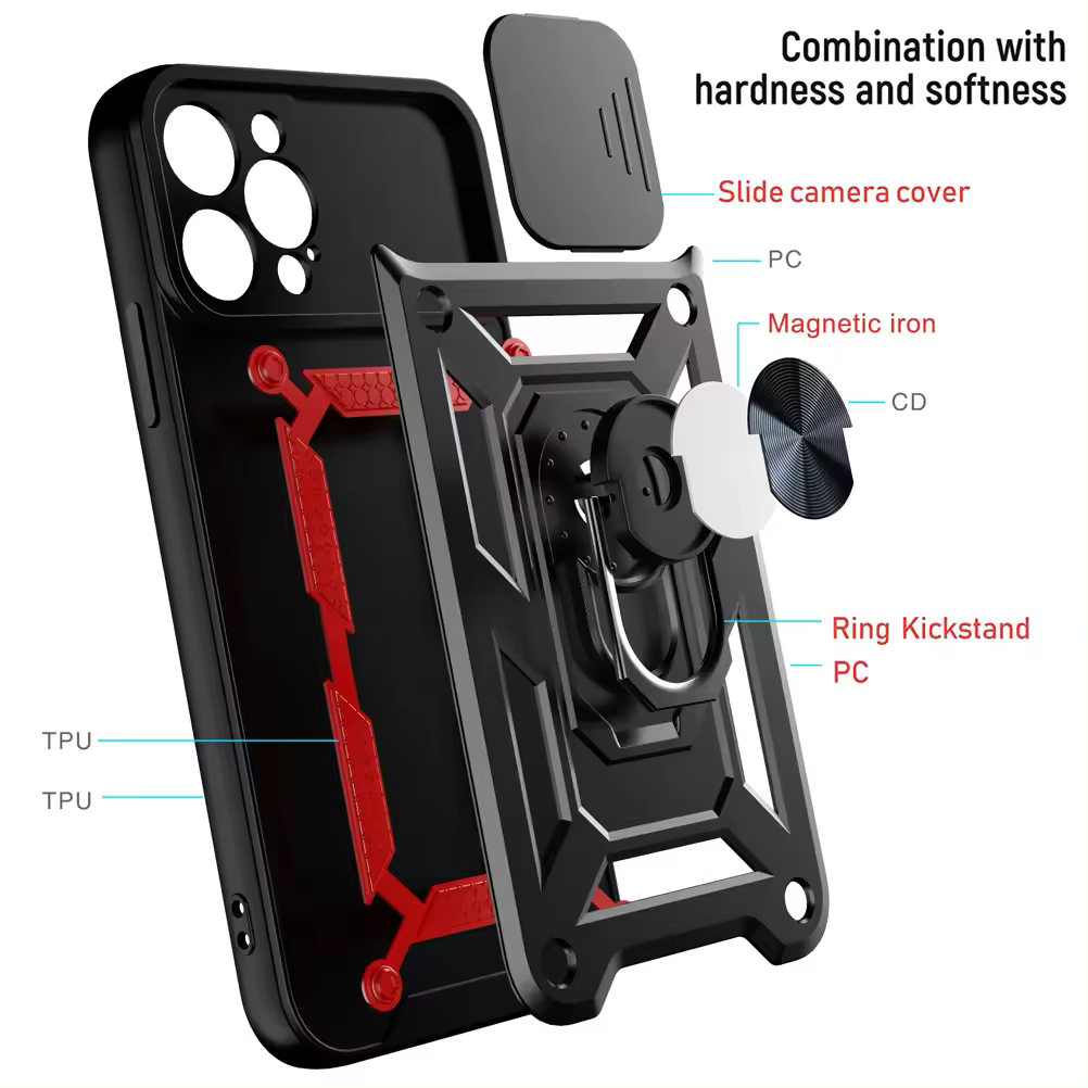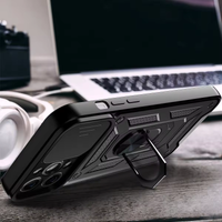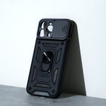 Safeguard your iPhone 13 with the Chokore Sliding Metal Ring Stand Case in black. Featuring a sliding metal ring stand for hands-free use and a camera lens protector, this case ensures comprehensive protection and functionality.