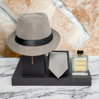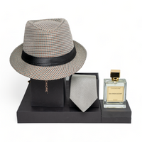Step into the realm of timeless elegance with this sophisticated gift set! Elevate your style with a classic houndstooth fedora hat, an iconic accessory that adds a touch of debonair charm to any ensemble. Complementing this allure, our suave necktie exudes refinement making it perfect for adding a polished touch to your formal look. And that's not all! Our perfume sets the mood with its captivating fragrance, leaving a lasting impression wherever you go. Whether it's for a stylish friend or a treat for yourself, this dynamic trio promises to redefine your fashion quotient and exude an air of sophistication! Embrace the art of impeccable fashion and exude confidence with your impeccable style!
