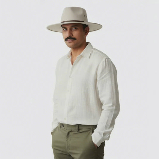 Elevate your accessory game with our stunning Chokore Urban Essence Jazz Fedora Hat crafted from 100% Australian wool. This elegant white hat features a stylish leather buckle belt and a chic teardrop crown, making it a perfect statement piece for any outfit. The rivet detailing offers a sophisticated look that provide a rich feel and great fit.