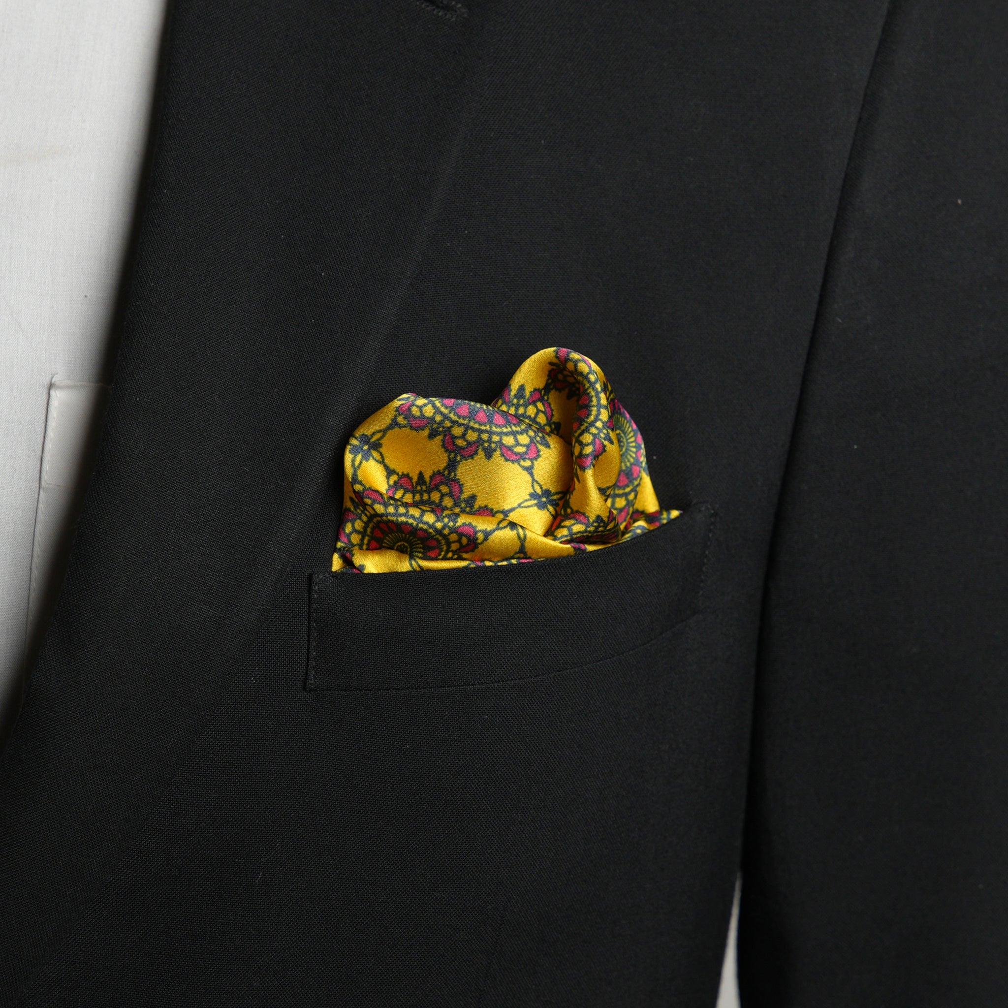 Introducing our Yellow & Off-White Pocket Square adorned with enchanting Indian motifs. Crafted from 100% pure silk, this accessory effortlessly blends vibrant yellow and subtle off-white, creating a versatile piece for both formal and casual occasions. The intricate motifs add cultural flair, making it a distinctive choice to elevate your ensemble with style and sophistication.
