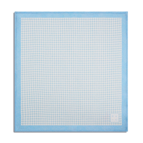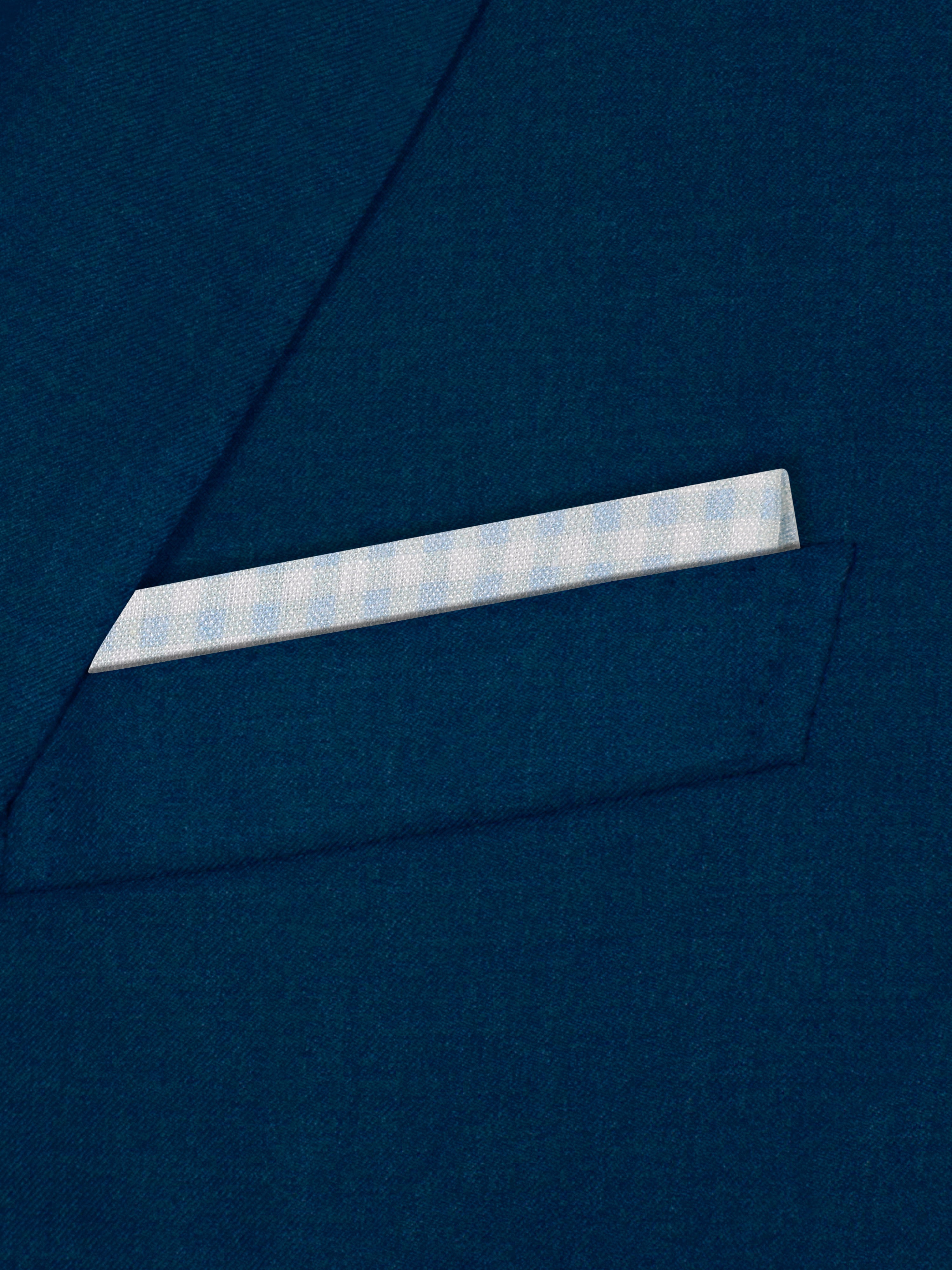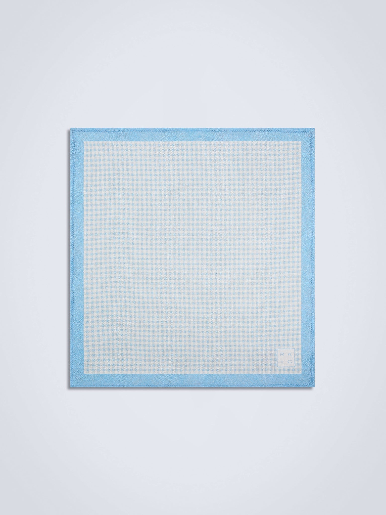 Perfect for when a “smart casual” dress code is the order of the day. This masculine plaid pattern in blue has a matching solid border and can be arranged to display only the checks, or also the solid edges. A sharp punctuation point to a smart jacket.