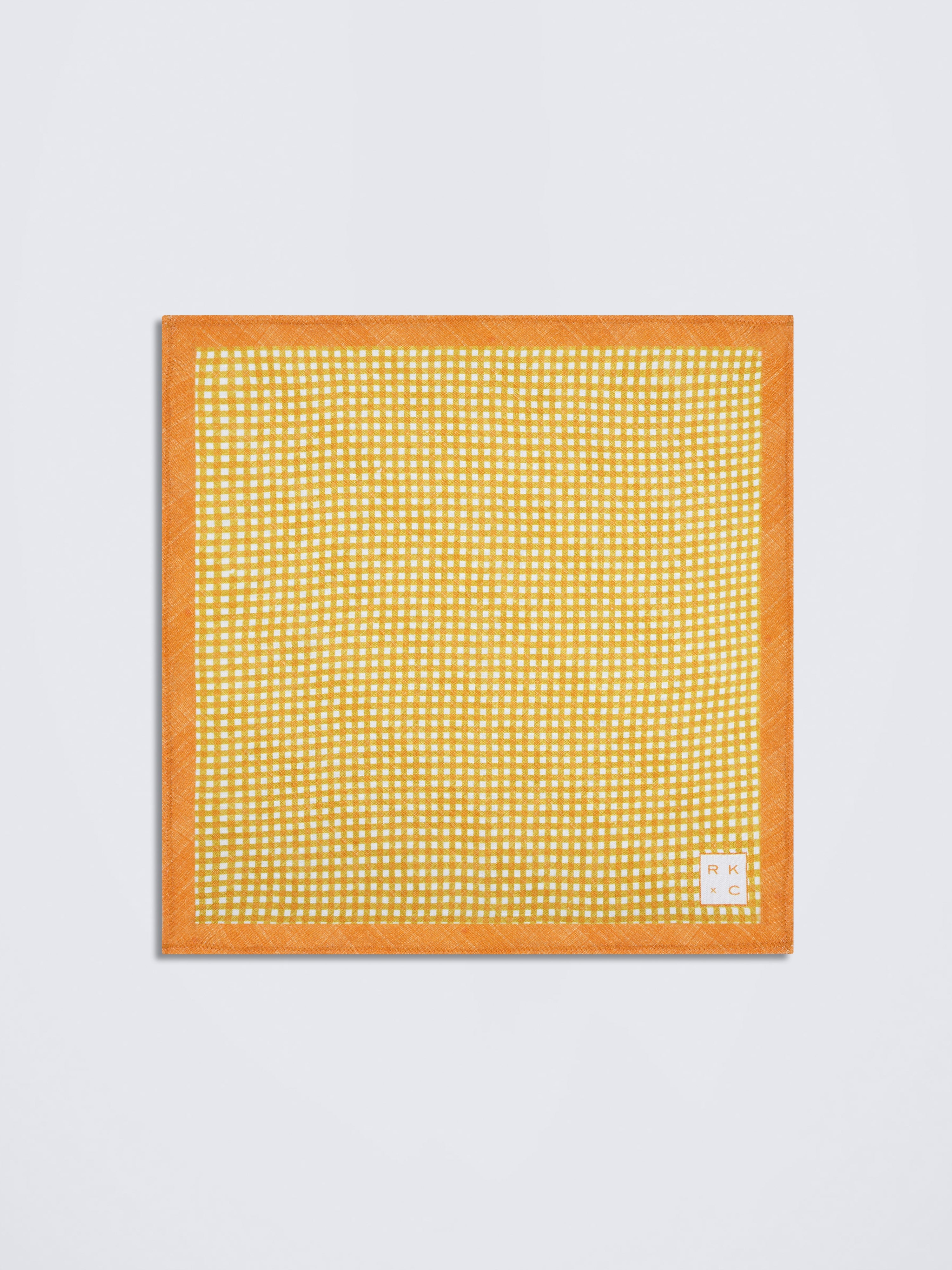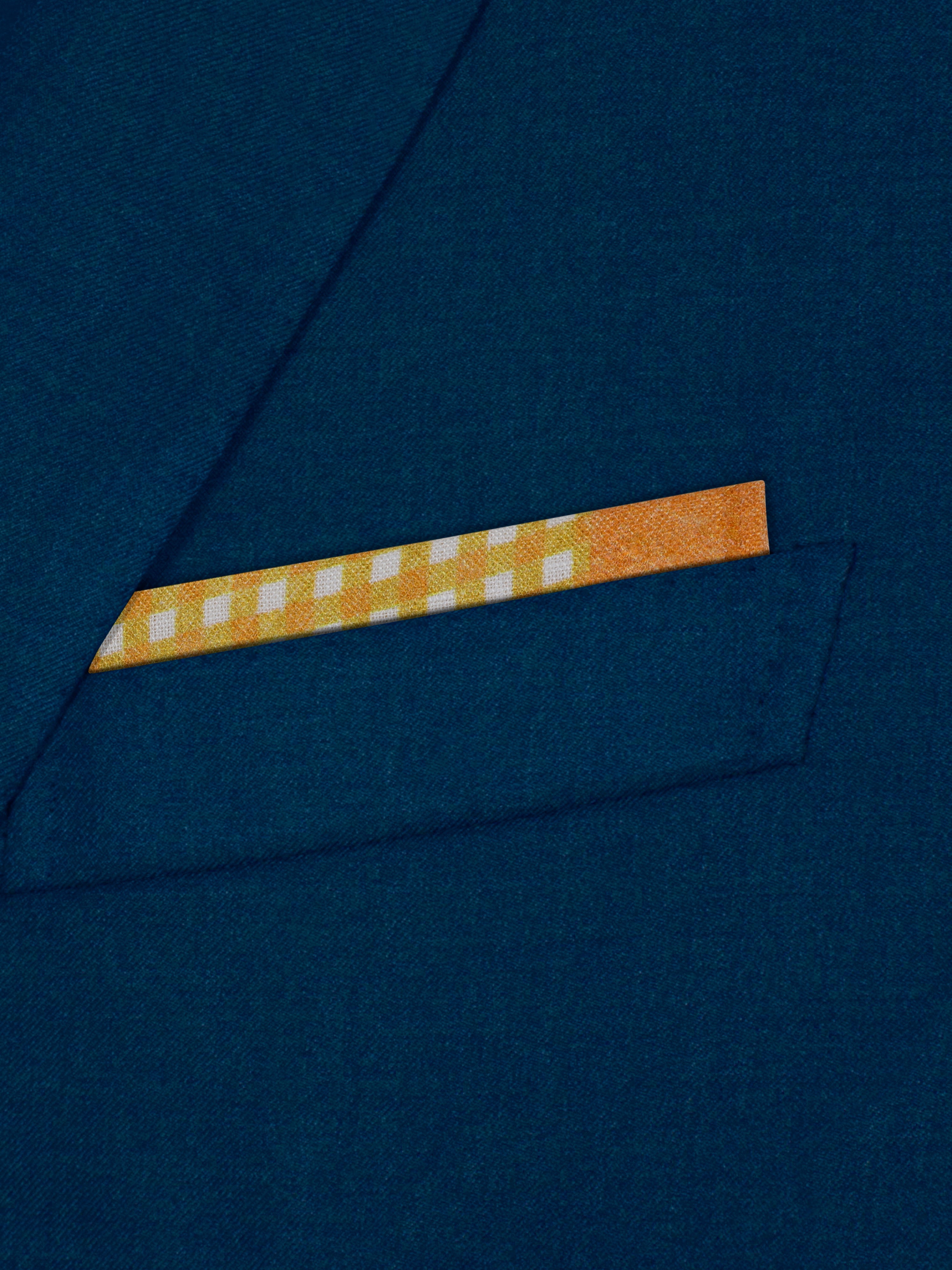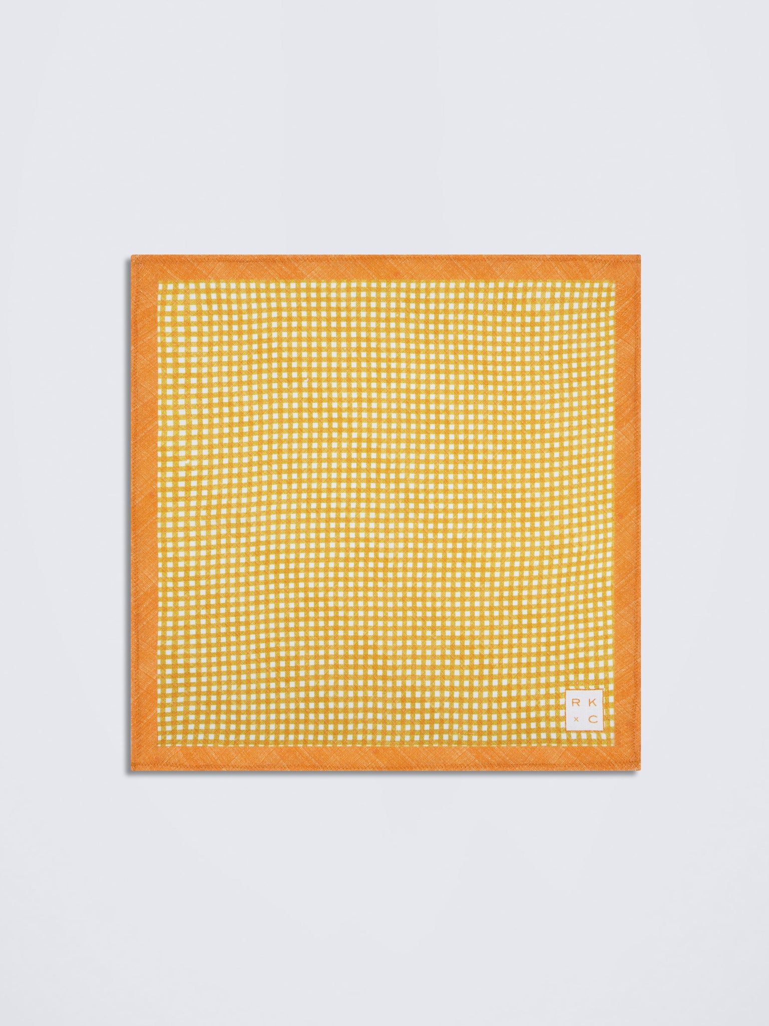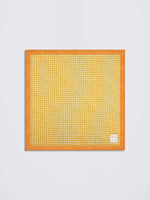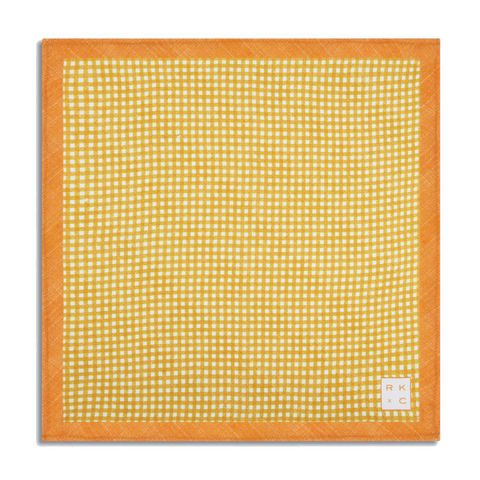 Perfect for when a “smart casual” dress code is the order of the day. This masculine plaid pattern in orange has a matching solid border and can be arranged to display only the checks, or also the solid edges. A sharp punctuation point to a smart jacket.