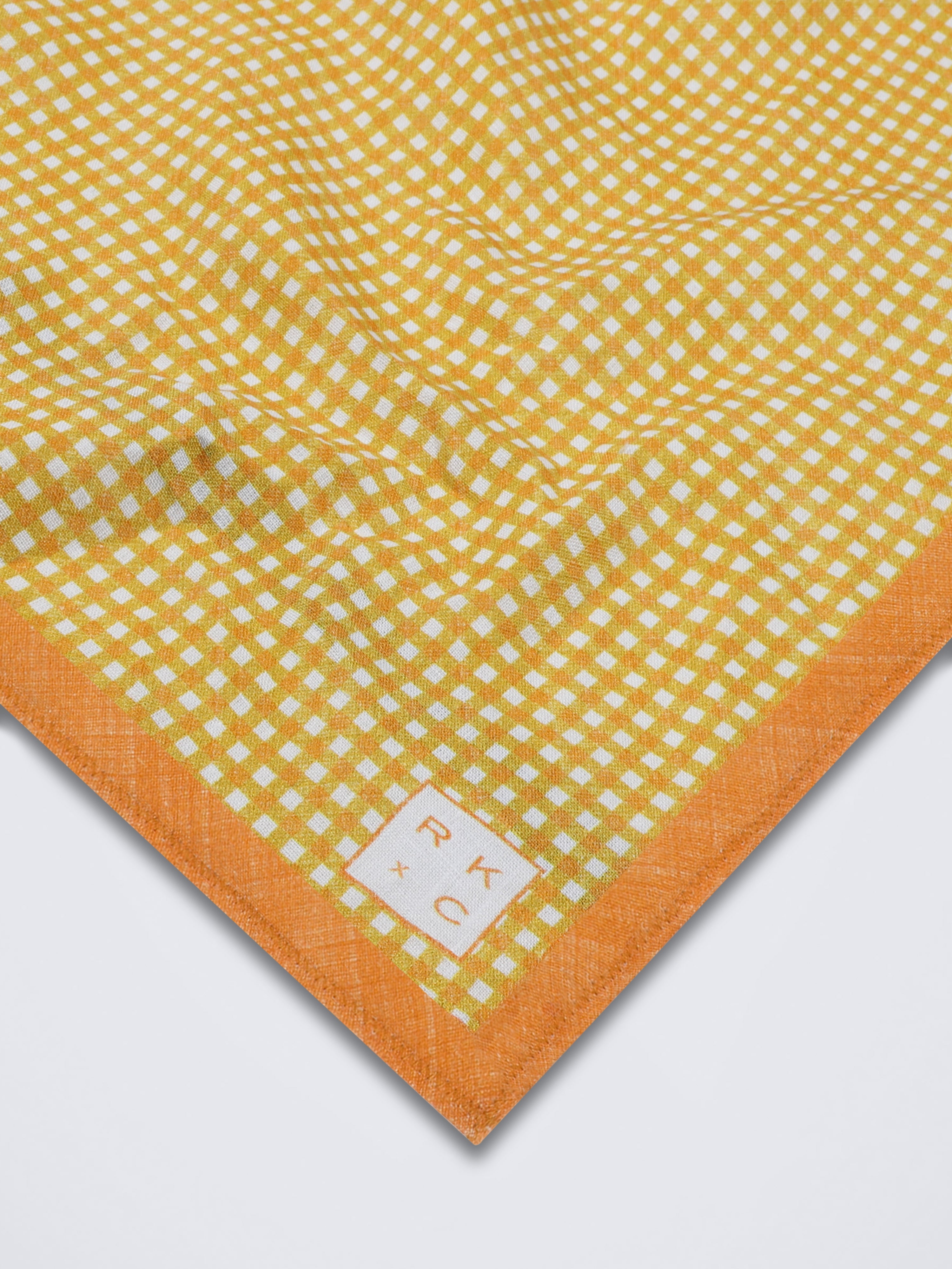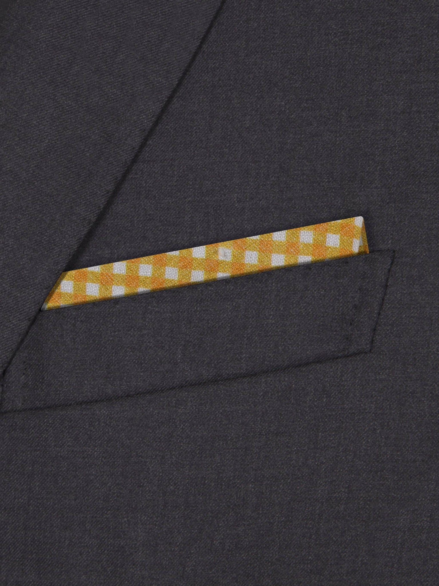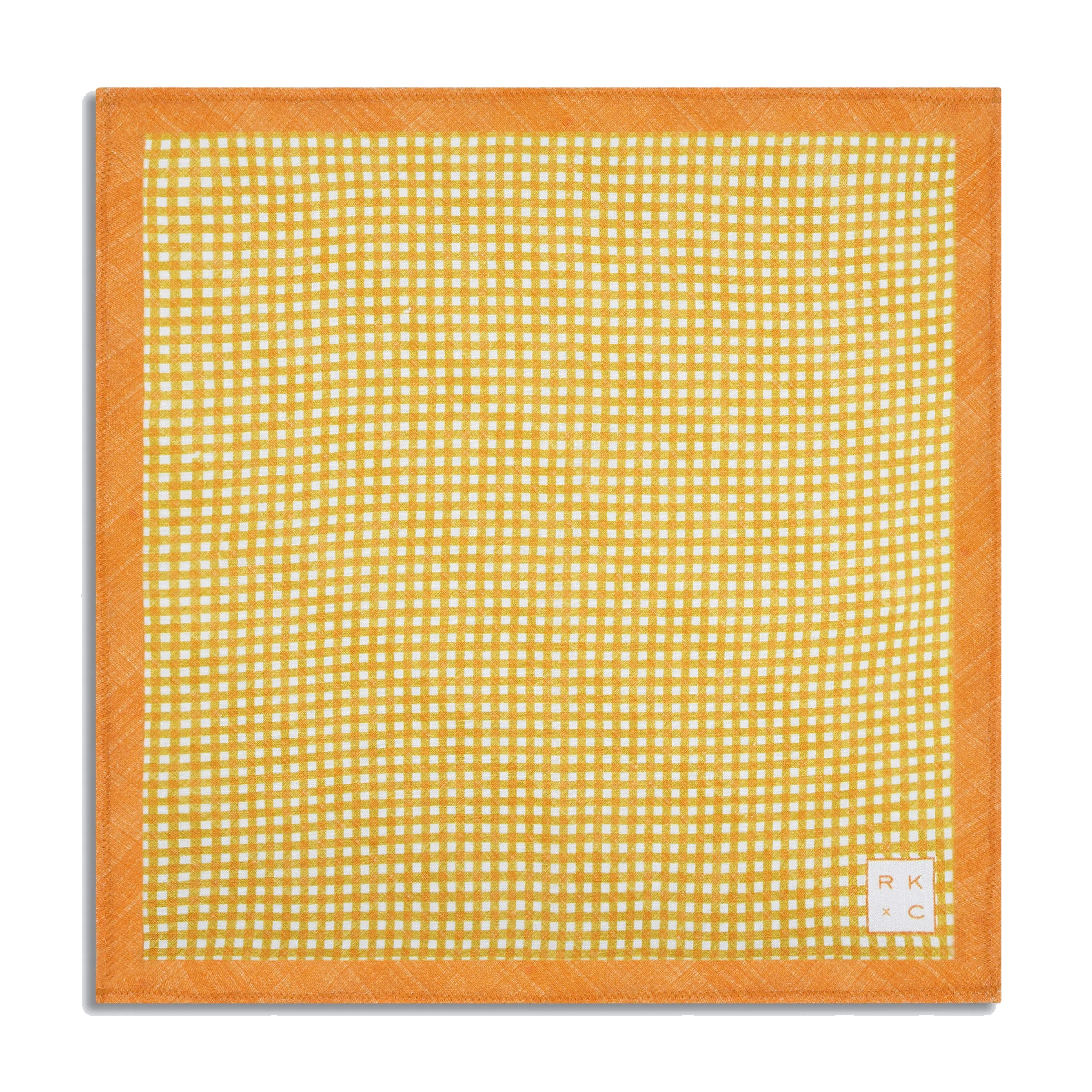 Perfect for when a “smart casual” dress code is the order of the day. This masculine plaid pattern in orange has a matching solid border and can be arranged to display only the checks, or also the solid edges. A sharp punctuation point to a smart jacket.