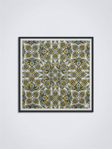 To us, this retro, paisley design, in shades of green on an off-white background, recalls a spring breeze over the verdant meadows of Gulmarg.