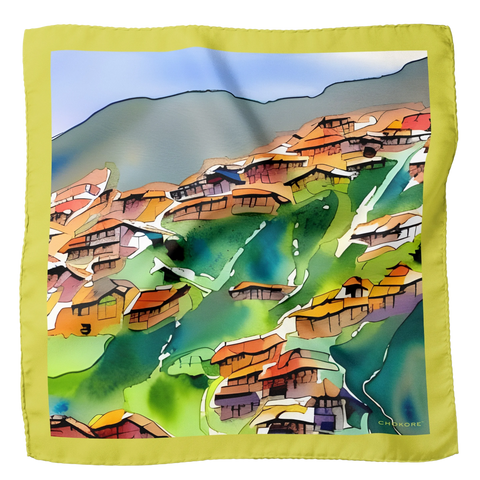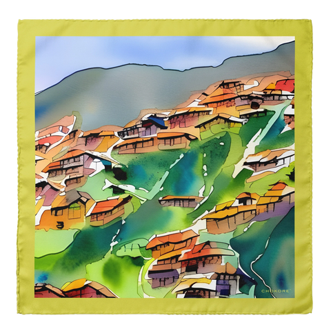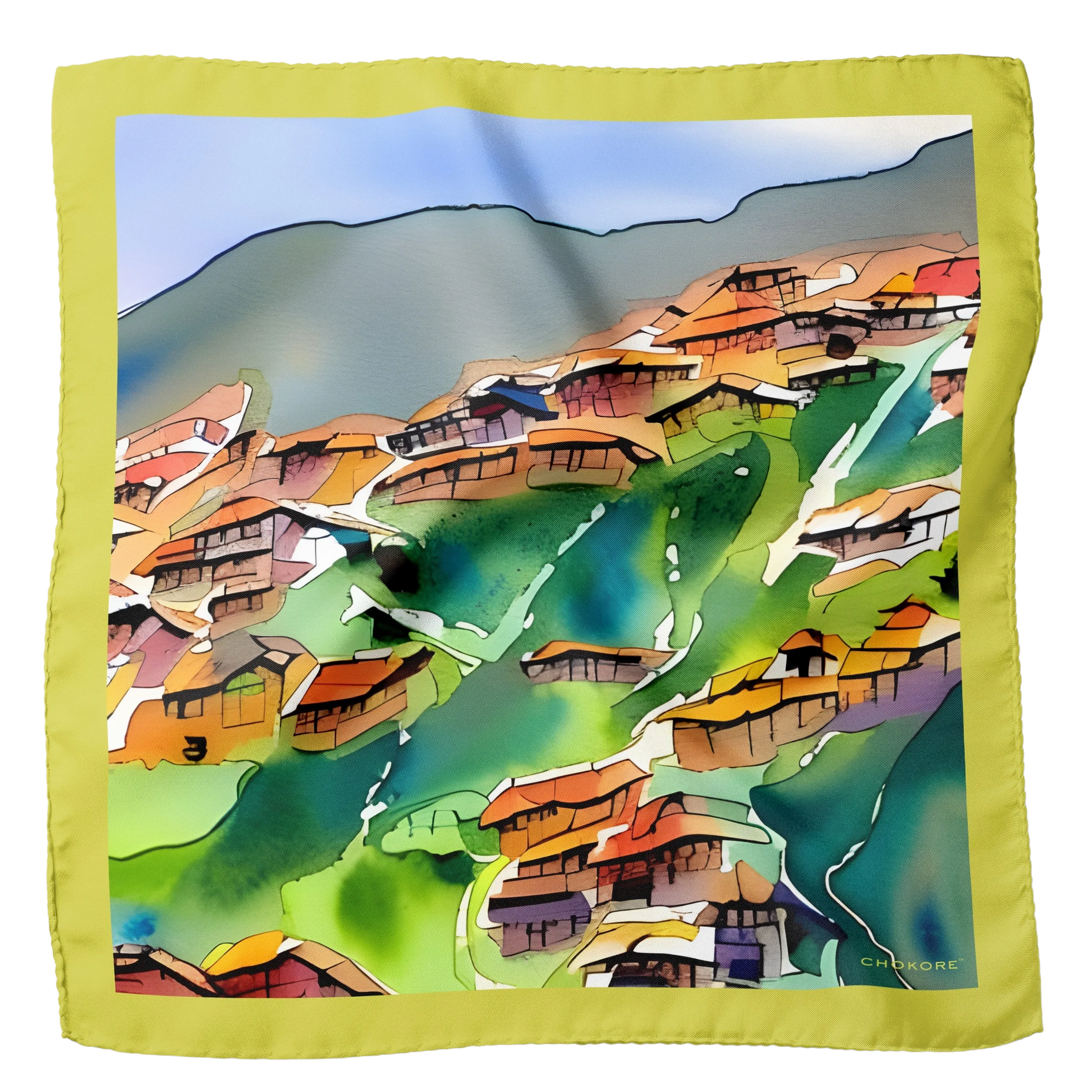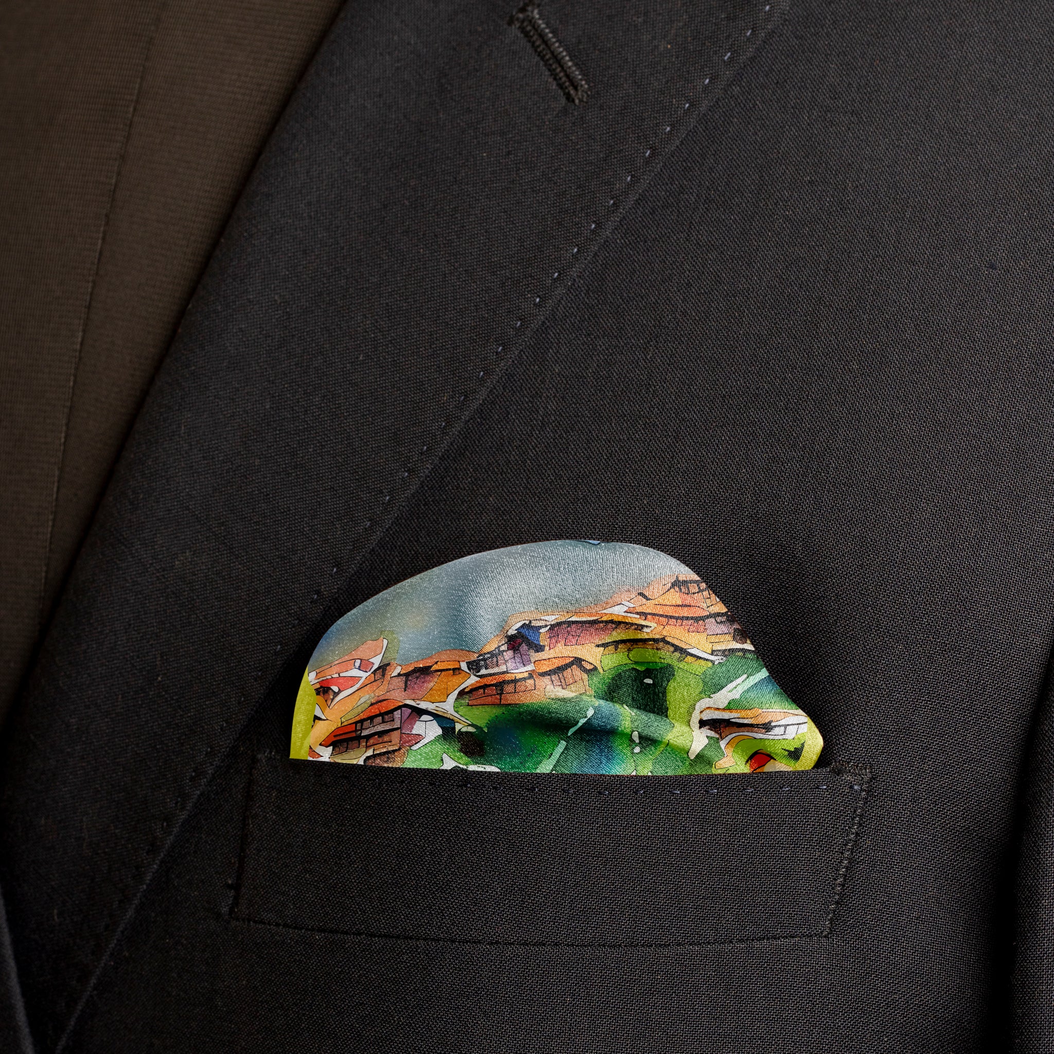 Where the beauty of the mountains soars and the air is pure and bright, Shimla holds a treasure of nature's might, a tranquil escape for those in flight. This pocket square is a symbol of art and love, a representation of all that is pure and above. And the Chokore Arte Collection takes this to new heights, combining culture and creativity with timeless delights. The brushstrokes of Van Gogh and the delicate details of da Vinci, now come to life on silken canvas, a true masterpiece, magnificent and pretty. This pocket square is a pioneer, a true innovator in the Indian fashion sphere, showcasing the perfect harmony of art and technology, so dear. Created with reverence for the artists of old, it is a shining emblem of a city that never grows old, where nature's grandeur reigns supreme, a place that shines like a precious gem.